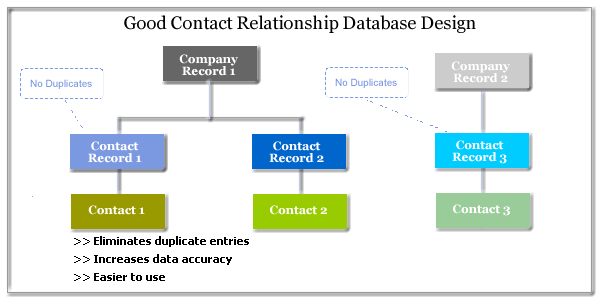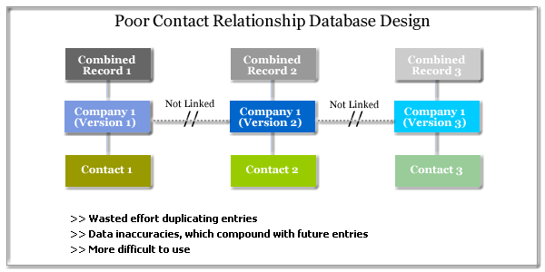 Most personal information management systems (PIMS) like ACT! and Outlook do contact management the wrong way for companies that have customers, suppliers and partners with multiple contacts. They require you to create duplicate company information for each contact record. So your business is not only wasting time but also is unable to clearly see all the relationships and records tied to a particular customer, supplier or partner. This poor design is sure to cause inefficiencies by forcing your employees to dig for information scattered throughout your customer database.